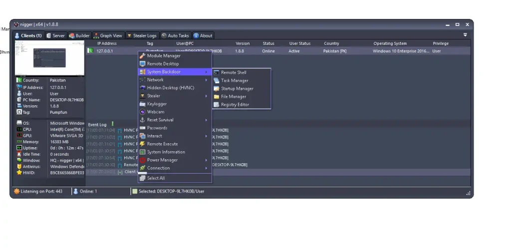 Once deployed, Nigger RAT v1.8 allows full system control.